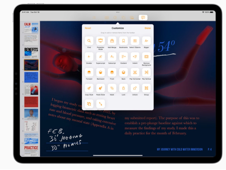 桌面级 App 带来一系列针对 iPad Pro 显示屏优化的新功能,通过新元素和崭新的交互模式令 App变得更强大,包括全系统通用的撤销和重做、经过重新设计的查找和替换体验、新版文档菜单、可自定义的工具栏、更改文件扩展名和在文件 App中查看文件夹大小的功能等。