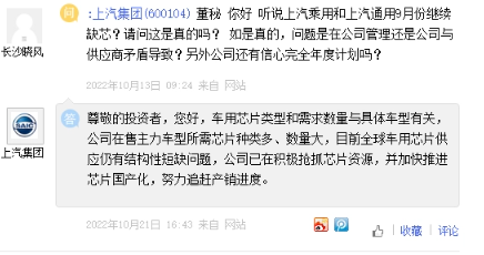 面对有投资者询问“缺芯”的问题,上汽集团表示,车用芯片类型和需求数量与具体车型有关,公司在售主力车型所需芯片种类多、数量大,目前全球车用芯片供应仍有结构性短缺问题,公司已在积极抢抓芯片资源,并加快推进芯片国产化,努力追赶产销进度。