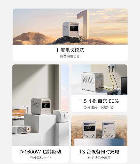这款户外电源采用了 280500mAh 大容量电芯,可为大部分露营设备提供多次供电续航,可以支持 220V / 1600W大功率输出,搭载升维驱动技术,超过 1600W 功率的大功率电器也能带得动。