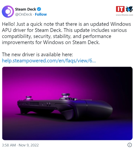 11 月 10 日消息,Valve 为想要在 Steam Deck 上运行 Windows 10/11的用户发布了一个新的驱动程序。据该公司称,最新版本包括针对 Steam Deck 运行 Windows 的各种兼容性、安全性、稳定性和性能改进。