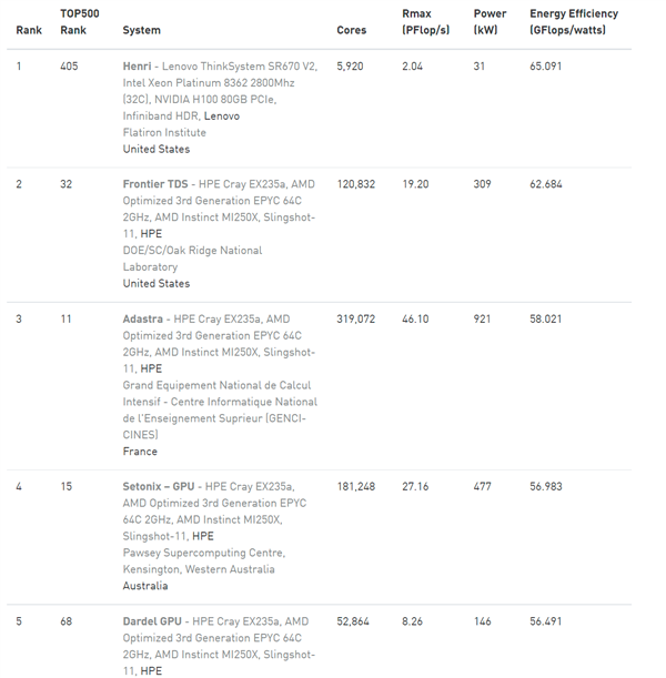 不过本文的重点不是超算性能,而是另一个侧重能效的Green500超算,这次排行第一的是Henri超算,基于联想ThinkSystem SR670 V2,CPU是Intel的Icelake架构至强Platinum 8362,GPU加速卡则是NVIDIA的H100 80GB PCIe显卡。
