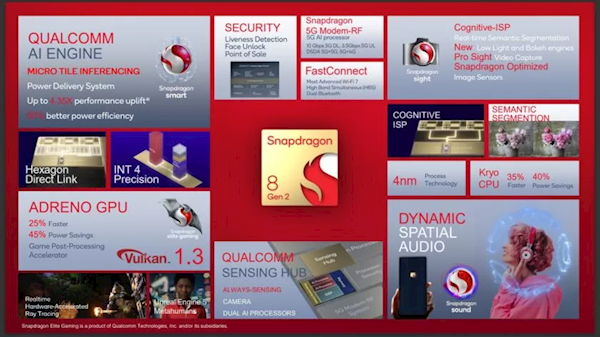 骁龙8 Gen2采用台积电4nm工艺制程,内部型号SM8550-AB,号称要在2023年再度颠覆旗舰机格局,官方主要强调的看点包括突破性的AI性能、无与伦比的连接性、冠军级游戏体验、可信安全等。