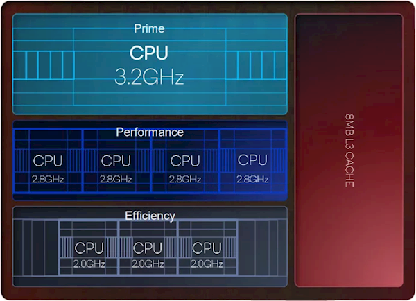 CPU架构上,骁龙8 Gen2采用1个基于Cortex-X3的Kryo超大核,主频3.2GHz、4个性能核(2 x Cortex A715+ 2 x Cortex A710,均为2.8GHz)、3个Cortex-A510能效核(小核,频率2.0GHz)。
