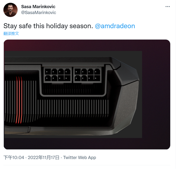 今晚AMD游戏营销部门高级总监Sasa Marinkovic又发了一张图,配文表示“这个假期季节还是安全点好”,并@了AMD的Radeon显卡官方账号。