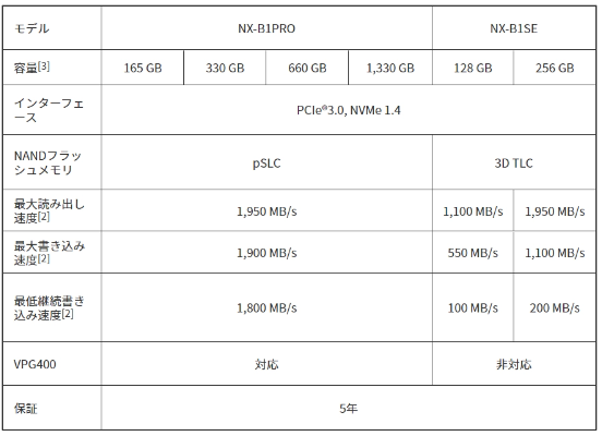 B1 SE 系列 (NX-B1SE) 系列提供 128 GB 和 256 GB 两种容量,分别为 10000、20000 日元,主要用于高质量静态摄影,该系列存储卡读取速度同样为 1950 MB/s(128GB 为 1100 MB/s),写入速度为 1100 MB/s(128GB 为 550 MB/s),连续写入速度最低可保证维持在 200 MB/s(128GB 至少为 100MB/s)以上,有助于提高工作效率。