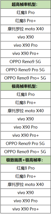 其中,支持极高帧率+极致画质的机型新增三款,分别是红魔8 Pro系列、摩托罗拉moto X40、vivo X90系列。