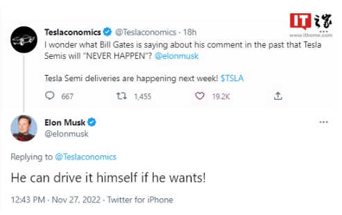 埃隆-马斯克后来回应了盖茨的批评,指出这位微软联合创始人“什么也不懂”。特斯拉 Semi 交付临近,马斯克昨日在 Twitter 上称,如果盖茨愿意,他可以亲自来开一开特斯拉 Semi。