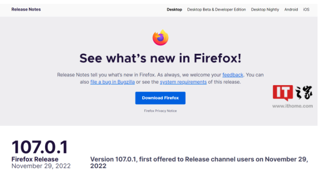 11 月 29 日消息,火狐浏览器 Firefox 今日迎来 107.0.1 版本更新,带来多项修复改进。