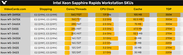 根据曝料,至强W-3000系列分为W9、W7、W5三个级别,其中旗舰至强W9-3495X 56核心112线程,缓存105MB,基准频率1.9GHz,热设计功耗350W,另一款至强W9-3475X则是36核心。