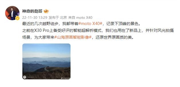 陈劲晒moto X40样张 延续智能超解析模式 呈现山海原画智能影像
