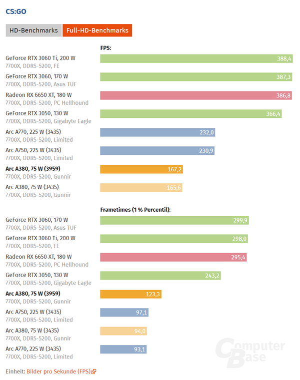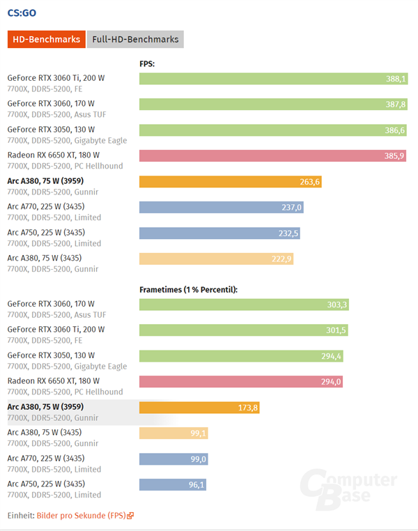 那实际游戏如何呢?computerbase网站公布了测试结果,由于时间紧急,他们只测试千元级的A380显卡在CSGO游戏中的表现,测试分为720p HD及1080p FHD两个分辨率。