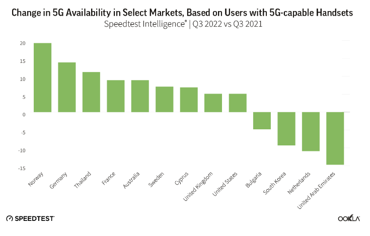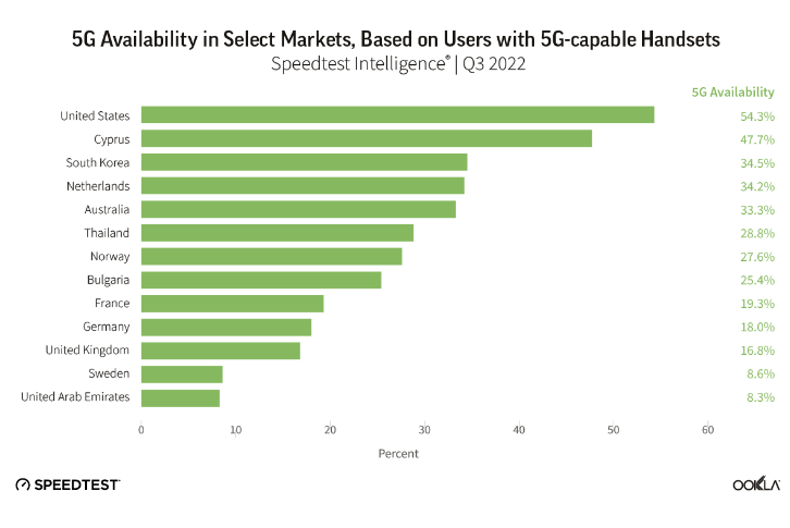 Ookla 报告 全球 5G 网速平均下行 168.27Mbps 韩国和阿联酋突破 500Mbps