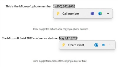 简单来说,在Win11 Build25115中,当复制特定文本后会有弹窗给出智能化建议,比如复制一段类似电话号码的数字,会弹出拨号、Teams、Edge搜索等快捷方式,复制日期会弹出添加到日程等。