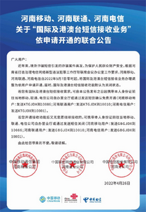 对于有国际及港澳台短信接收需求的河南省用户,可携带本人身份证前往当地移动、联通、电信公司自办营业厅或通过发送短信确认免费开通。