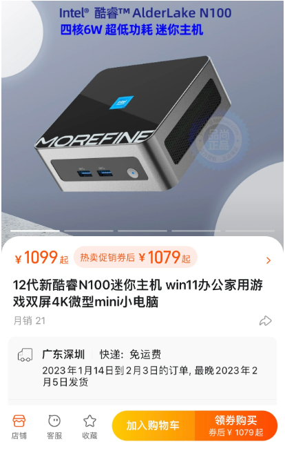 如上图所示,淘宝已有第三方店铺开卖 morefine 的 M9 迷你主机,N100 准系统配置,售价 1099 元,券后 1079 元。