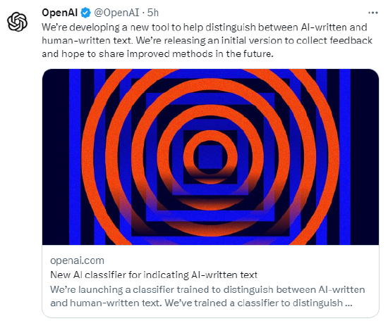 OpenAI推出ChatGPT“克星” 可识别文章是否人工智能代笔