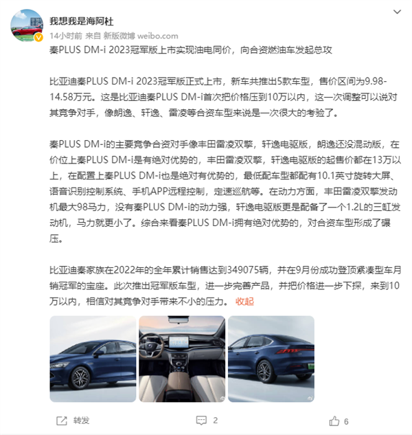 雷凌轩逸压力大 比亚迪秦PLUS DM-i 2023冠军版上市3天订单破1.5万 9.98万起