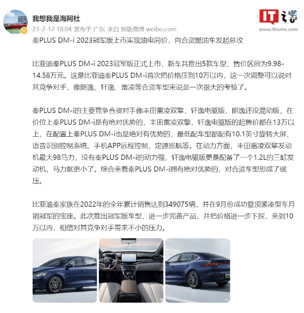对此,比亚迪汽车品牌及公关事业部副总经理杜国忠在社交媒体表示,秦 PLUS DM-i 2023 冠军版上市实现油电同价,向合资燃油车发起总攻,“这是比亚迪秦 PLUS DM-i 首次把价格压到 10 万以内,这一次调整可以说对其竞争对手,像朗逸、轩逸、雷凌等合资车型来说是一次很大的考验了。”