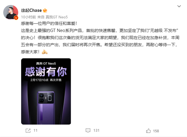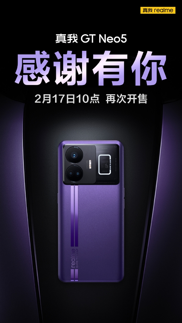 真我realme副总裁徐起表示,真我GT Neo5是史上最强的GT Neo系列产品,现在已经在加急补货,本周五(明天)会有一部分的产出,届时将再次开售。