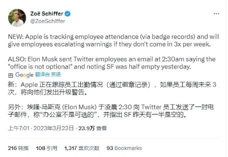 【ITBEAR科技资讯】3月23日消息,据国外科技媒体 Platformer 的 Zoë Schiffer报道,苹果公司正在实施新的出勤政策,通过徽章记录员工的出勤情况,以确保员工每周在公司办公室工作 3天的时间。如果员工未达到要求,则可能会发出“增强警告”。