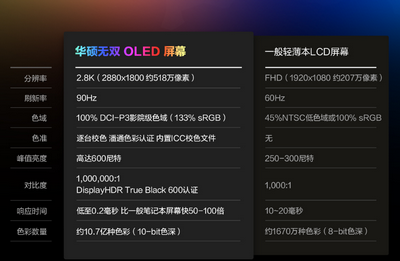 一直以来,OLED屏幕凭借着高饱和度色彩显示、高亮度以及高对比度等优势在笔电市场备受关注。 “华硕好屏”作为华硕轻薄笔记本OLED屏幕独有标准,在原有OLED屏基础上大幅度升级,目前更是成为OLED屏笔记本的规格标杆。