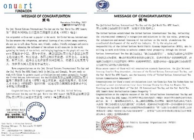 现场宣读了联合国艺术基金会(ONUART)和联合国世界公共经济组织(WPEO)贺电。联合国艺术基金会(ONUART)热烈祝贺第三届联合国国际茶日暨第二届世界茶派克(APEC)峰会在北京成都召开,愿同中国一起通过联合国国际茶日推动全民乡村振兴共同富裕。联合国世界公共经济组织(WPEO)有使命和责任推动世界各国茶文化的交融互鉴,促进世界茶产业的协同发展,祝贺第三届联合国国际茶日暨第二届世界茶派克(APEC)峰会取得圆满成功!
