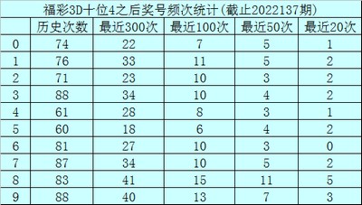十位杀号:上期十位奖号为4,历史上十位奖号4共出现770期,前100次十位开出奖号4时,其下期0-9奖号频次分别为:奖号8开出15次,9开出13次,1开出11次,2、3、6、7开出10次,4开出8次,0开出7次,5开出6次。