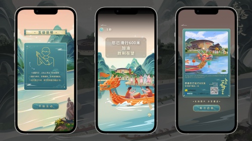 为了让广大民众亲自体验“龙腾虎跃”龙舟比赛中争分夺秒的竞渡盛况,用户可通过“一水同舟向未来”小程序在云端模拟划桨动作晃动手机,在限定时间内快速滑动手中的“船桨”,让自己手中的“龙舟队”赛出更长的里程,行程超过50米将可获得端午特别纪念版数字藏品。