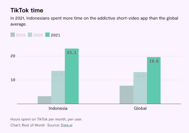 印尼用户每月在短视频上平均耗时23.1小时,而世界平均值为19.6小时。