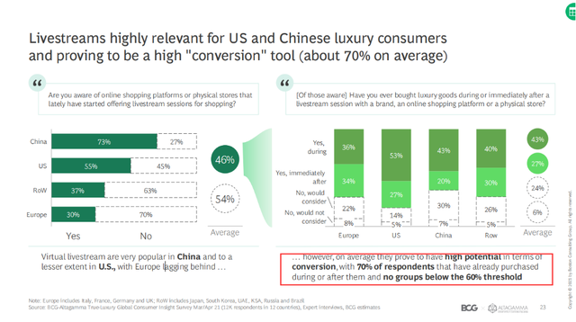 研究表明,奢侈品直播带货在几个主要国家及地区的平均转化率,能够达到70%。其中,美国消费者当中,53%在直播过程中就直接下单购买,另有27%的消费者在直播结束后购买相关产品。