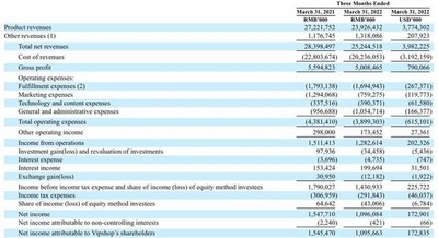 2022年第一季度唯品会主要会计数据