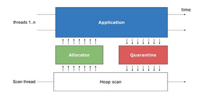 在调用删除时,内存实际上被放入隔离区,无法再用于应用程序的后续新调用。“在某些时候触发了 heap scan,它扫描整个堆,就像垃圾回收器一样,以查找对隔离内存块的引用。那些没有从常规应用内存中获得引用的块被转移回分配器,在那里它们可以被重新用于后续的分配。”