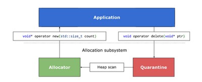 工作原理在于,用隔离和 heap scanning 保证 temporal safety 的主要思想是避免重用内存,直到证明没有更多的(悬空的)指针指向它。为了避免改变 C++ 用户代码或其语义,提供 new 和 delete 的内存分配器被拦截。