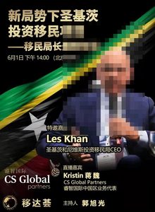 6月1日下午,加勒比政府独家授权的官方市场营销机构CS Global Partner睿智国际与圣基茨和尼维斯投资移民局合作举办了圣基茨和尼维斯投资移民项目的线上研讨会。投资移民局局长Les Khan着重介绍了新局势下的项目改变,旨在帮助广大移民中介和项目方深入了解项目,并回应移投行业从业者们的问题。此外,局长更针对因为疫情护照无法更新的申请人做出解决方案。此次研讨会的演讲者包括圣基茨和尼维斯投资移民局局长Les Khan和CS Global Partner睿智国际中国区业务代表蒋魏。