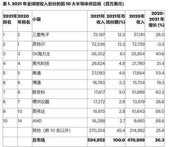 按照Gartner公布的数据,2021年全球半导体总收入达到5950亿美元,增长率26.3%。入围榜单前十的IC芯片巨头,瓜分了其中的3250亿美元,占比达到了54.6%。