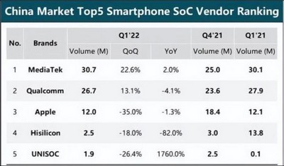 根据前段时间市场研究机构CINNO Research的数据,今年第一季度国内手机系统级芯片(SOC)的市场占有率方面,联发科、苹果、高通占据了国内市场69.4%的份额,海思却暴跌了82%,仅剩2.5%。