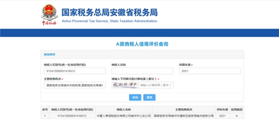 上图为国家税务总局安徽省税务局网站信用评价结果截图