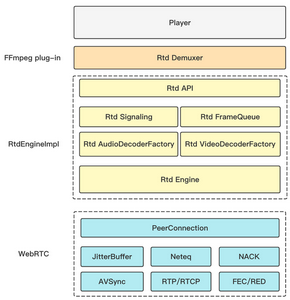 - RtdEngineImpl: 低延时播放引擎,既 WebRTC 封装层,包含 API、引擎创建、信令建联、媒体数据的接收回调等。