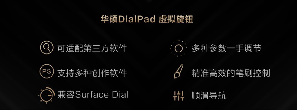 华硕独有的DialPad虚拟旋钮进一步优化迭代,为用户提供了更加智能的创作体验。DialPad虚拟旋钮拥有70多种功能,多种参数一手控制,多种笔刷指尖调节,图层、时间轴等功能精准控制,让创作工作流程将会变得更加顺畅。华硕DialPad虚拟旋钮目前可兼容多款创作办公软件,也兼容Surface Dial等辅助设备。
