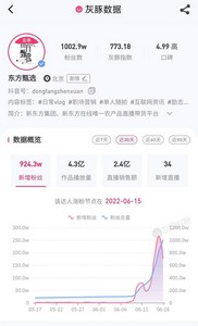 “东方甄选”突然爆火2021年12月28日,新东方宣布成立“东方甄选”,进军直播带货,这也是“双减”政策实施以后,新东方为谋求发展而选择的新道路。6月8日,新东方创始人俞敏洪在个人公众号“老俞闲话”中表示,“我对新东方的定义是成为以教育产品为核心的教育公司。产品需要销售渠道,我发现最有效的销售渠道除了找代理,就是直播带货。”11日晚,新东方英语老师董宇辉以中英混合方式在“东方甄选”进行直播,中英直播带货的方式带动“东方甄选”出圈,截至6月16日14:40东方甄选抖音平台粉丝数量超过1000万,相较于6月9日的112万,暴涨近900万。