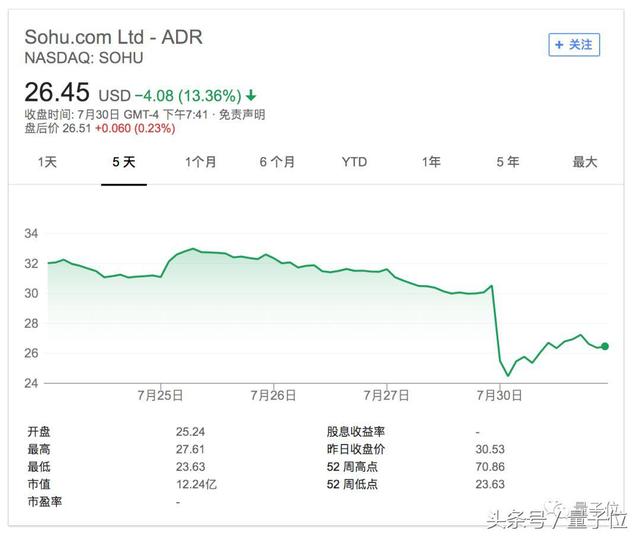 但搜狗这顿打,也并非全无原因。首先,受自己亲爹搜狐不给力拖累。搜狐昨天也发布了上一季度财报,总营收4.86亿美元,相比去年同期增长5%,净利润亏损4900万美元,比去年同期相比有所收窄,但亏损幅度之大,一个搜狗净赚的钱,都不够填补了。更何况搜狐这份财报,比华尔街分析师们预计的还要差。原本根据雅虎财经汇总的数据,华尔街4位分析师平均预计,搜狐第二季度总营收将达5.022亿美元。但财报显示,搜狐第二季度总营收为4.86亿美元,不及分析师预期。所以搜狐财报一发,股价盘中一度大跌逾20%,最后收盘于26.45美元,整体跌幅达13.364%。
