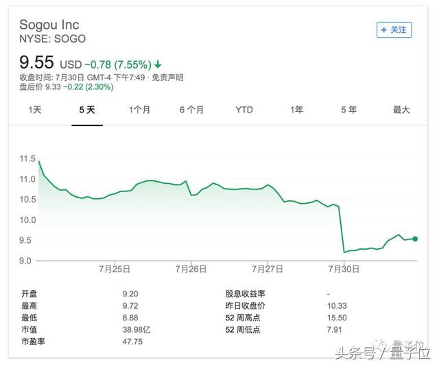 △ 搜狗营收示意这是一个什么概念呢?搜狗自创立以来,就没有单季度赚过如此多的钱,而且历史上首次营收迈入3亿美元大关——开始奔“4”。结果上来说,该是一个满心欢喜的成绩单才对。然而大跌眼镜的是,财报发布后,搜狗股价不涨反跌,最高跌幅超过10%,最后收盘于9.55美元,整体跌幅达7.55%。
