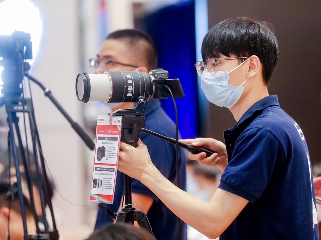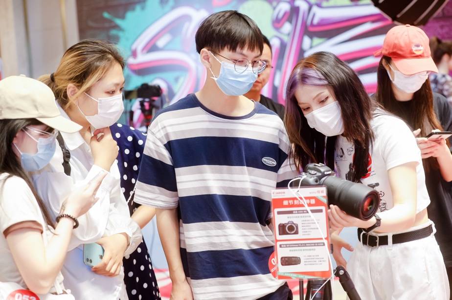 在体验环节中,同学们热情高涨,不仅可以摸到佳能最新款设备,更有多个拍摄区域等着大家。同学们在现场设置的国潮人像、旅行暗光、ins风静物以及Vlog视频4个拍摄体验区域内边拍边学。
