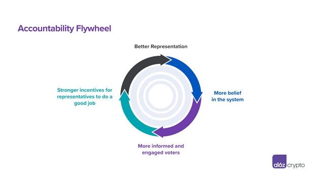Web3 让我们以不同的方式思考这个问题。Web3里没有董事会,而且许多参与者是匿名的,参与和脱离组织的门槛很低。 一般来说,社区成员越知情、越细心,代表们做好工作的动力就越强。而当代表做得更好,利益相关者就会更相信组织制度,也更愿意投入时间和精力去关注组织,这又进一步增强了代表做好工作的动力。如果可以良性循环,系统本身可以实现自我强化,也就是说:良好的治理会产生更多的良好治理——我们称之为问责飞轮。