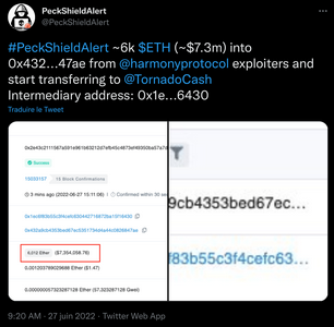 1 亿是攻击者在 Harmony 的 Horizon 桥上窃取的金额。 然而,后者似乎并不倾向于谈判,并已承诺通过 Tornado Cash 转移资金以掩盖他的踪迹。