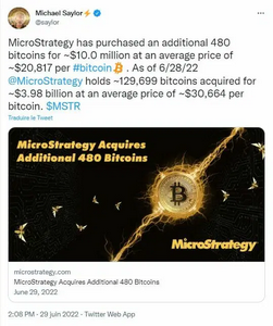480 是 MicroStrategy 公司刚刚购买的 BTC 数量。 因此,它利用价格下跌来增加其金库中的 BTC 数量。