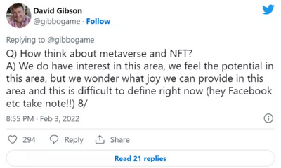 接下来是任天堂(Nintendo),游戏公司领域的庞然大物,我认为如果有任何将实体收藏品转变为数字收藏品的机会,那将是来自任天堂。在一次问答中,David Gibson 说:"我们确实对这个领域有兴趣"。