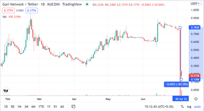GARI 的看跌运动始于 6 月 20 日,然而,其长期支撑在 6 月 4 日放弃,当时该代币暴跌 83.29% 至历史最低交易价 0.13 美元。 不久之后,投资者开始将这种情况与 Terra (LUNA) 和 TerraUSD (UST) 的崩盘进行比较,其中一名成员称该演员为“Salman Kwon”。