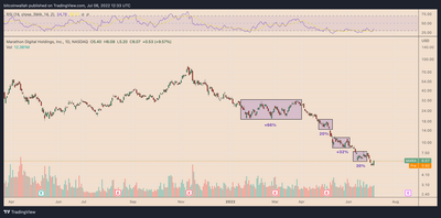 例如,下面的 MARA 股票K线走势图显示了几个在整个看跌周期中短暂上涨的案例。