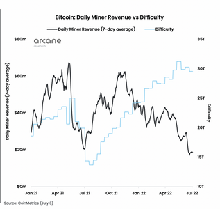 比特币每日矿工收入与难度。 资料来源:CoinMetrics/Arcane Research